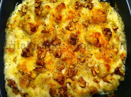 Noi ieri sera ci siamo concesse un grande piatto:Gnocchi di zucca e patate gratinati al forno con besciamella al castelmagno, granella di noci croccante e pepe nero.