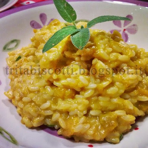 L’abbinamento di sapori trovo sia molto azzeccato: esso é una rivisitazione del risotto alla salvia e zucca che avevo fatto tempo fa, ma arricchito dal gorgonzola..