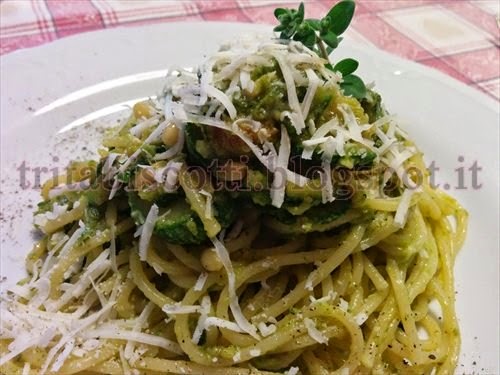 Spaghetti al contrasto di zucchine con pinoli, maggiorana e formaggio caprino
